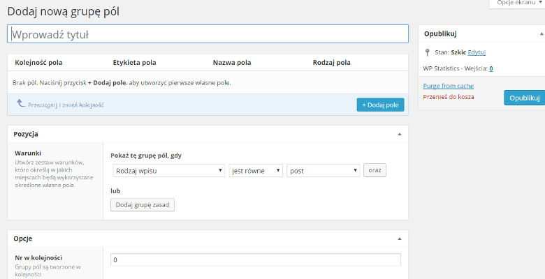 Stworzone przez nas grupy pól, możemy następnie przypisać do konkretnego typu strony, wpisu lub kategorii. Do dyspozycji posiadamy mamy kilka warunków, dzięki czemu kryteria gdzie pojawią się nowe pole możemy określić precyzyjnie. Ustawiamy je w polu „Pozycja”.