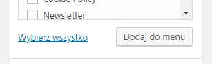 W zaznaczonym na niebiesko kwadracie mieszczą się wszystkie strony, kategorie, odnośniki i np. w moim przypadku newslettery – to jakie będą tam dostępne opcje w dużej mierze zależy od szablonu jaki używamy oraz od zainstalowanych dodatków. Wszystkie te elementy spięte są w rozwijanym menu (harmonijkowym jak np. FAQ). Interesujące nas elementy wybieramy poprzez zaznaczenie w polu wyboru, a następnie wybranie opcji dodaj do menu. Postępujemy analogicznie w każdej z zakładek – wybierając tylko te elementy, które nas interesują.