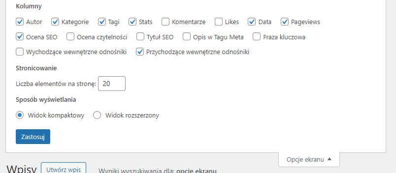 Następnie rozwijamy pole „opcje ekranu” umieszczone w prawym górnym rogu.